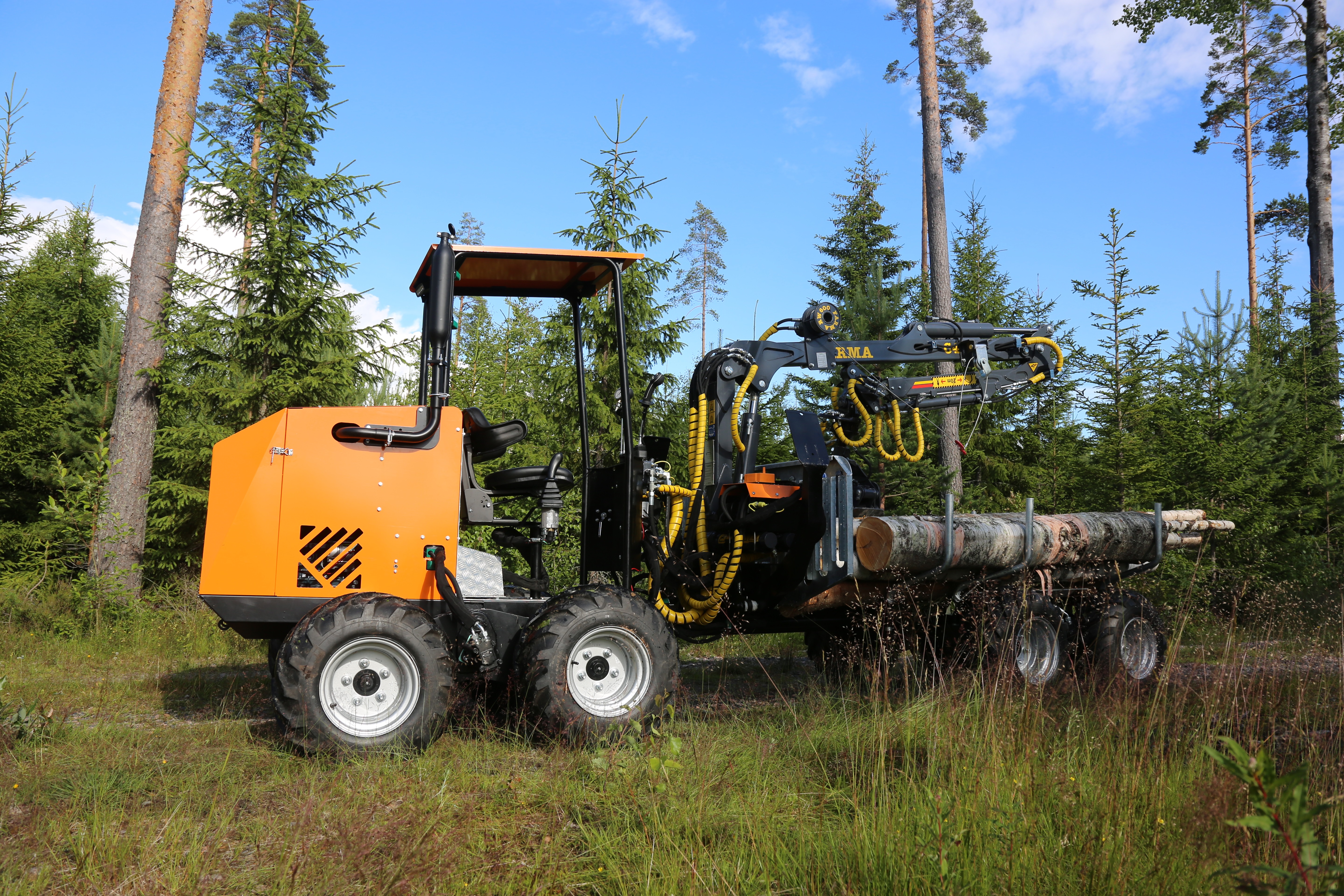 A 1500 mm wide, 5 meter long machine, light enough to tow behind a van, strong enough to forward storm-fallen trees all day. Designed by foresters. Built in Finland.